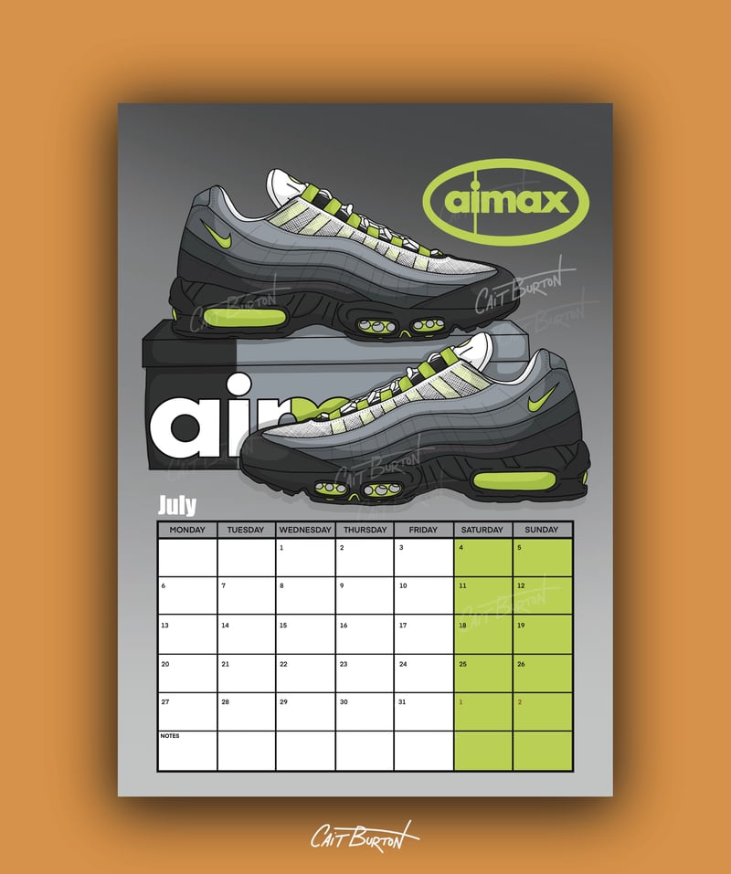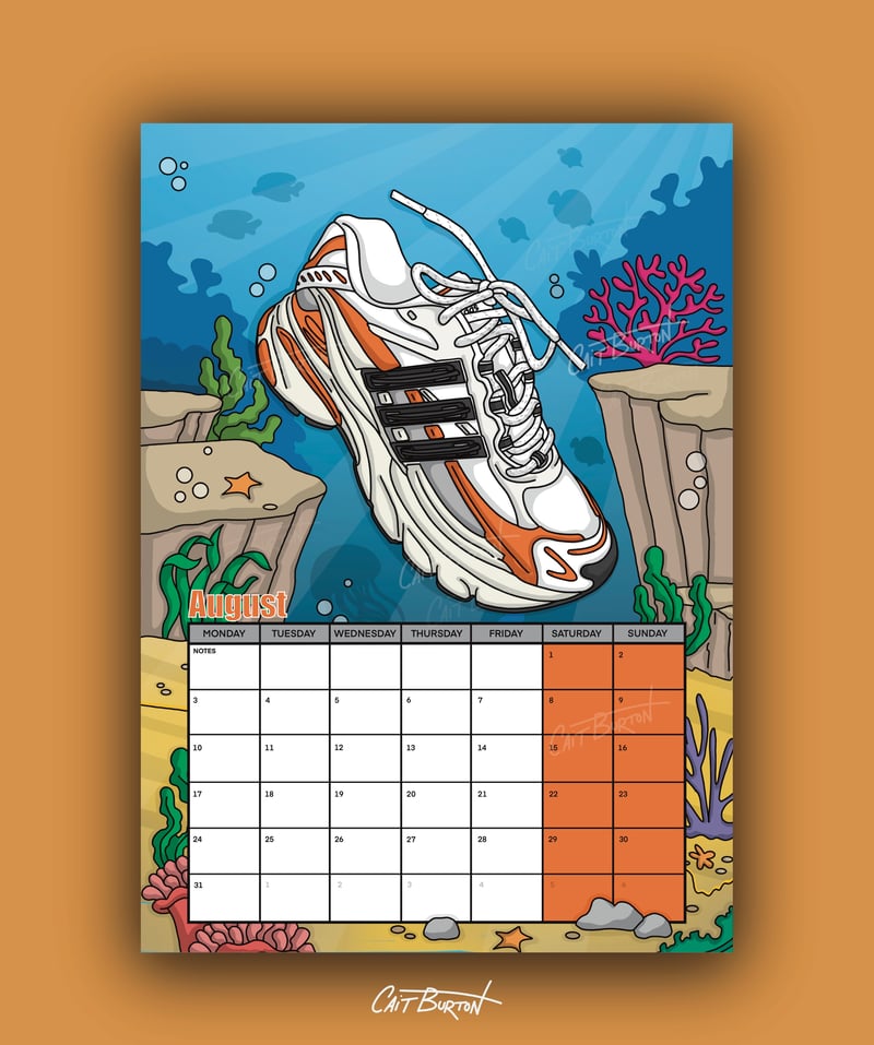Featuring some of this years best sneakers releases, all 12 designs are hand illustrated by me and professionally printed onto 250gsm premium silk paper. Ring bound and ready to hang upon arrival.